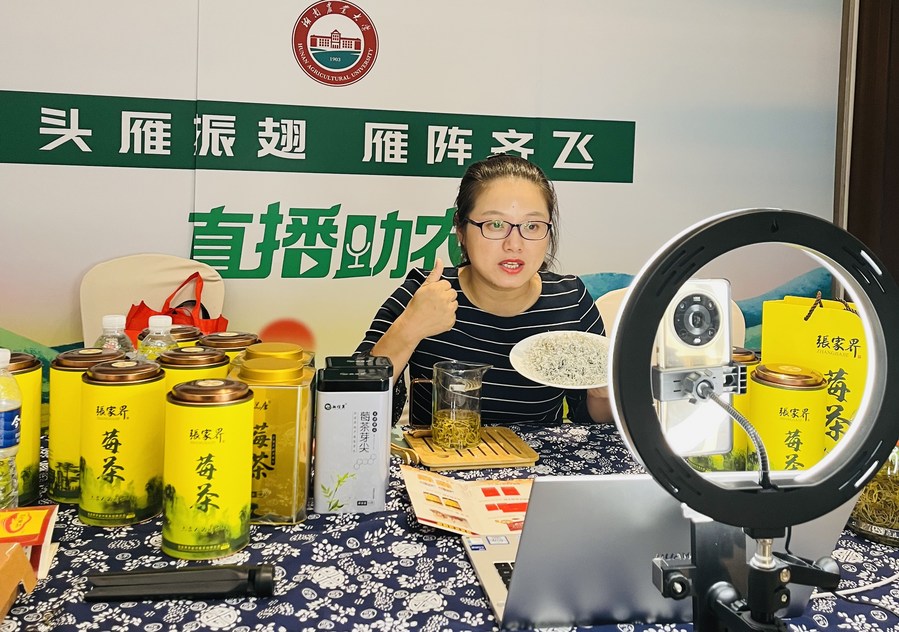 Montrant une bo?te à thé devant son smartphone, Li Chunyan a présenté avec enthousiasme le ? thé de vigne ? spécial cultivé dans les monts Wuling, pour en promouvoir les ventes en ligne.