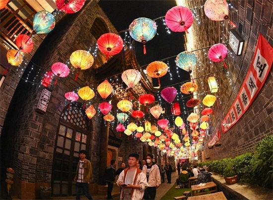 Le 9 mars 2023, la rue culturelle et historique du Palais Wanshou est bien illuminée dans la ville de Nanchang de la province du Jiangxi (dans le sud-est de la Chine). (Li Jie/Pic.people.com.cn)
