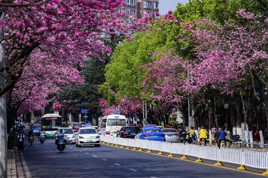 Le 11 mars 2023, des véhicules circulent dans une rue où les fleurs de cerisier sont en pleine floraison dans la ville de Kunming de la province du Yunnan (dans le sud-ouest de la Chine). (Zheng Yi/Pic.people.com.cn)