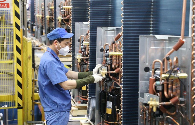 Un ouvrier est occupé sur la cha?ne de production d'une entreprise de climatisation à Qingdao, dans la province du Shandong (est de la Chine), le 15 mai 2023. (Photo / Xinhua)