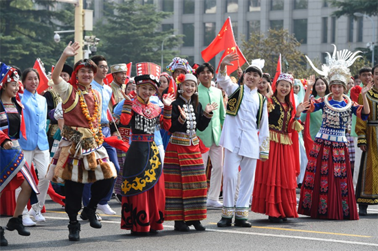 Une formation affichant l'unité ethnique participe à un spectacle de masse célébrant le 70e anniversaire de la fondation de la République populaire de Chine, le 1er octobre 2019 à Beijing. (Fan Peishen / Xinhua)