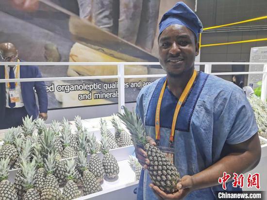 Rock Agossou présente des ananas du Bénin lors de la 6e CIIE. (Zhong Sheng / China News Service)