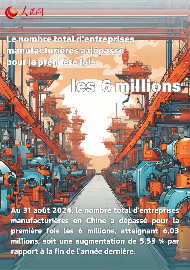 Au 31 ao?t 2024, le nombre total d'entreprises manufacturières en Chine a dépassé pour la première fois les 6 millions, atteignant 6,03 millions, soit une augmentation de 5,53 % par rapport à la fin de l'année dernière.