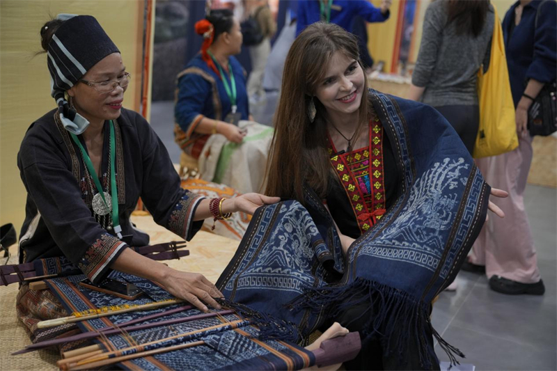 | Le 8 novembre 2024, la Semaine culturelle mondiale de la broderie Hainan 2024 (4e édition) a eu lieu au centre d'exposition de la province de Hainan (sud de la Chine), où des visiteurs russes ont admiré l'art de la tapisserie de la minorité ethnique Li de Hainan. (Zhang Mao / Pic.people.com.cn) |