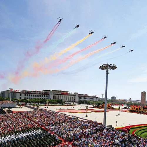 Passage des hélicoptères au-dessus de la place Tian'anmen.