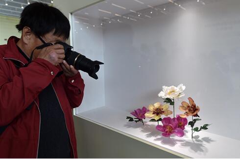 Un visiteur photographie des fleurs de pivoine séchées dans le pavillon international de l'Exposition internationale d'horticulture de Beijing, le 29 avril. (Weng Qiyu /vip.people.com.cn)