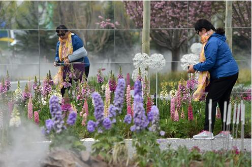 Des touristes prennent des photos devant le parc d'attractions de l'Exposition internationale d'horticulture de Beijing, le 29 avril. (Weng Qiyu / vip.people.com.cn)
