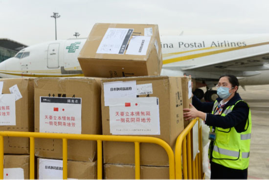 Le 12 mars, la cérémonie de transfert des matériaux donnés au Japon et à la Corée du Sud par le gouvernement populaire de la province du Zhejiang (est de la Chine) a eu lieu à l'aéroport d'Yiwu. (Qian Xusheng / Pic.people)