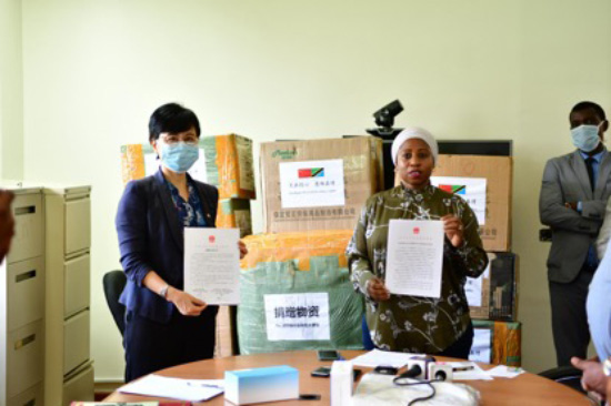 Le 8 avril, la cérémonie de remise des premiers dons de matériels de prévention et de contr?le de l'épidémie faits par l'ambassade de Chine en Tanzanie au gouvernement tanzanien a eu lieu à l'Institut national de recherche médicale de Tanzanie. Au nom de l'ambassade et de deux entreprises chinoises en Tanzanie, l'Ambassadrice Wang Ke (à gauche) a fait don de matériels de prévention comme des masques médicaux, des combinaisons de protection et des appareils de prise de température. La ministre de la Santé, du Développement de la communauté, du Genre, des Personnes agées et de l'Enfance Ummy MWALIMU a re?u le don au gouvernement tanzanien. Photo par l'ambassade de Chine en Tanzanie