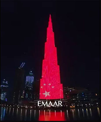 Le 3 février, le Burj Khalifa, aux émirats arabes unis, s'est illuminé d'un drapeau rouge à cinq étoiles chinois. (Photo tirée d'Internet)