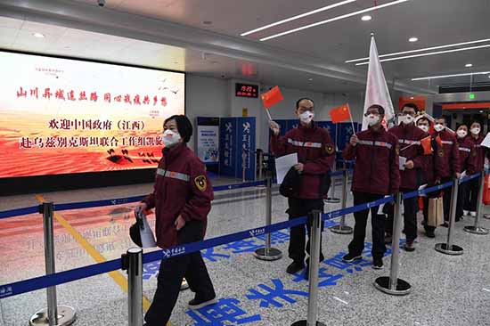 Le 28 avril 2020, dans la ville de Nanchang du Jiangxi, l'équipe conjointe de travail envoyée par la Chine en Ouzbékistan est rentrée à Nanchang par vol nolisé de l'Ouzbékistan après avoir accompli sa mission. Shi Yu/Photo du Quotidien du Peuple