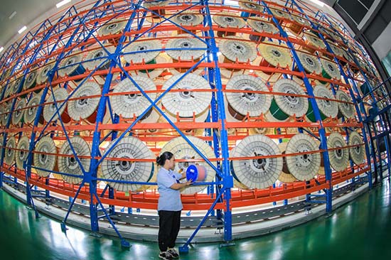 Le 27 juillet, dans la société Zhejiang Hengtong Optical Network IOT Technology Co., Ltd. dans la zone de développement économique Nanxun de la ville de Huzhou de la province du Zhejiang, des ouvriers ont accéléré la production des cables 5G destinés à être livrés à Beijing. (Liu Chunhui/Pic.people)