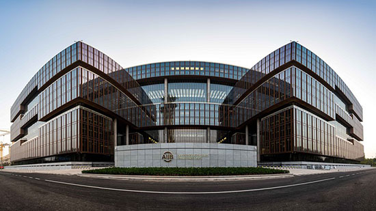Photo montrant l'immeuble de bureaux permanent du siège de la BAII, l'Asia Financial Building, à Beijing, qui ressemble à un n?ud chinois vu du ciel, ce qui signifie ? connecter le monde ?. (Photo BAII)