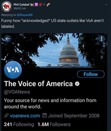 Twitter a étiquetté de manière spéciale le 6 ao?t comptes d'? entités médiatiques affiliées à l'état ? et leur personnel, une décision qui porte un coup sévère à des médias de pays comme la Chine et la Russie, alors que dans le même temps, des médias financés par des gouvernements occidentaux, comme la BBC et VOA, sont exemptés de ce genre de traitement en raison de leur ? indépendance éditoriale ?, ce qui a amené le public et des experts du monde entier à critiquer le géant de l'Internet pour ses ? doubles standards ? et sa ? violation de la liberté d'expression ?.