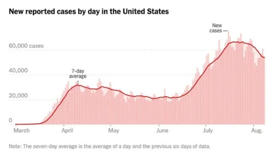 Le nombre de nouveaux cas chaque jour n'a cessé d'augmenter aux états-Unis. (Source: le New York Times)
