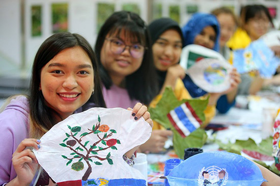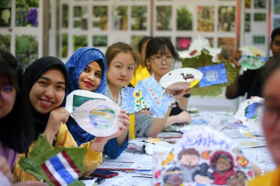 Le 24 octobre 2019, dans la ville de Nantong de la province du Jiangsu, des étudiants étrangers et chinois de l'Institut des sciences et de la technologie de Nantong fêtent la Journée des Nations Unies en dessinant sur les feuilles d'arbre. (Xu Peiqin/Pic.people)