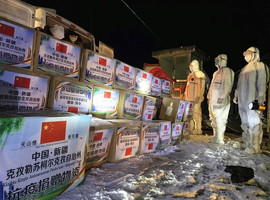 à minuit du 26 mars 2020, les 70 bo?tes de matériels médicaux de protection et de prévention, comme les masques chirurgicaux à usage médical et les combinaisons de protection, donnés au Kirghizistan par le gouvernement de la préfecture autonome kirghiz de Kizilsu de la région autonome ou?ghoure du Xinjiang ont été remis au bénéficiaire au col de Torougart du comté de Wuqia. (Ma Huibing/Pic.people)