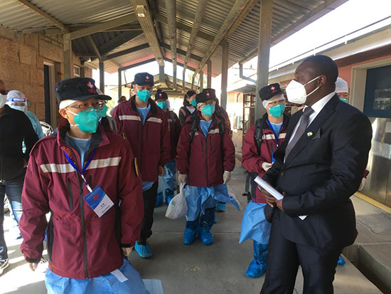 Le 30 septembre 2020, des experts médicaux chinois envoyés au Lesotho échangent avec des personnels médicaux locaux sur l'expérience de lutte contre l'épidémie dans l'h?pital désigné pour traiter les patients atteints du COVID-19 au Lesotho. (Photo fournie par l'équipe d'experts médicaux chinois envoyés au Lesotho)