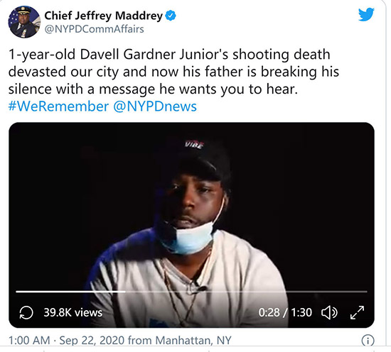 Davell Gardner Jr., un an, est décédé après avoir re?u une balle dans l'estomac alors qu'il était assis dans sa poussette lors d'un barbecue près d'une aire de jeux à New York. Son père a lancé sur Internet un appel plein d'émotion pour que la violence armée cesse. (Capture d'écran de la page Twitter de la police de New York)