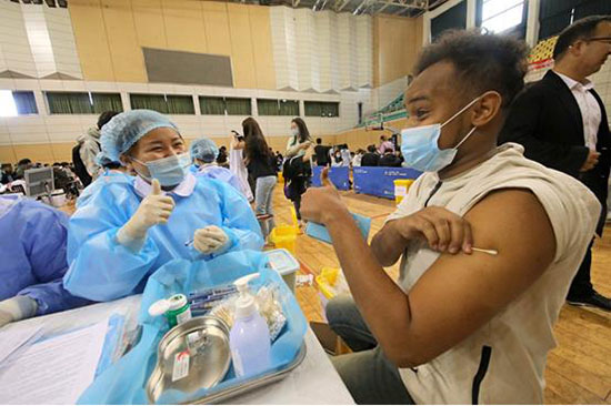 Le 21 avril 2021, sur le site de vaccination mobile du gymnase de l'Institut de technologie de Huaiyin, à Huai'an, dans la province du Jiangsu (est de la Chine), des étudiants étrangers de l'école ont été vaccinés contre le COVID-19. (Wang Hao / Pic. People.com.cn)