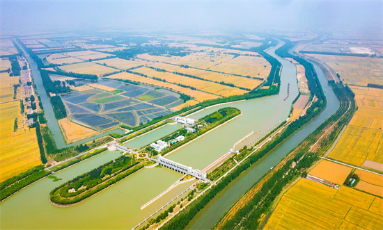 Une moissonneuse fait la navette pour une bonne récolte de blé de haute qualité entre des champs intercalés d'arbres fruitiers à Bigen, un complexe aquatique de 2000 mu situé dans le comté de Sihong de la ville de Suqian, dans la province du Jiangsu (est de la Chine), le 4 juin 2021. (Zhang Lianhua / Pic.people.com.cn)