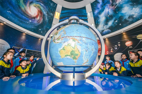 Des enfants découvrent la terre sous les explications d'enseignants professionnels au Musée géologique du Clou Doré de Changxing à Huzhou, dans la province du Zhejiang (est de la Chine), le 21 avril 2021. (Wu Zheng / Pic.people.com.cn)