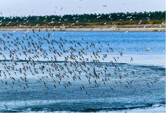 Des oiseaux migrateurs volent au-dessus de l'habitat de la marée haute ? 720 ? dans la réserve de Tiaozini, à Dongtai, dans la ville de Yancheng, dans la province du Jiangsu (est de la Chine), le 9 octobre 2021. (Sun Jialu / Pic.people.com.cn)