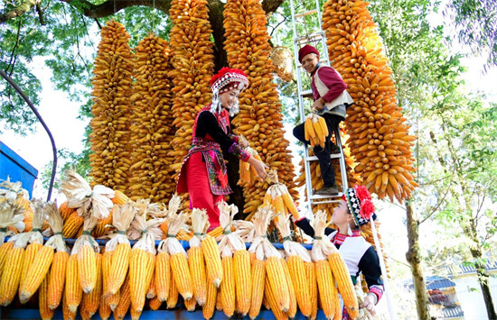 Les Yi du canton de Xisan de la ville de Mile, dans la préfecture autonome Hani et Yi de Honghe, dans la province du Yunnan (sud-ouest de la Chine), s'affairent à accrocher et faire sécher des ma?s récoltés alors qu'il faisait beau, le 19 novembre 2021. (Pujayong / Pic.people.com.cn)