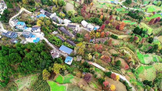 Des érables décorent une ferme dans la ville de Dingshi, dans le comté autonome Tujia et Miao de Youyang, dans la municipalité de Chongqing, le 22 novembre 2021. He Yi / Pic.people.com.cn)