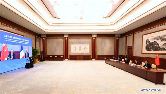 Le vice-président chinois, Wang Qishan, a salué les relations bilatérales Chine-France lors d'une rencontre virtuelle avec Emmanuel Bonne, conseiller diplomatique du président fran?ais Emmanuel Macron, le 13 janvier, à Beijing. (Photo/Xinhua)