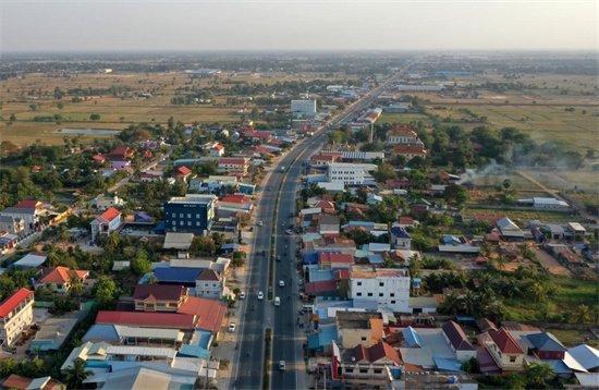 Le projet de reconstruction et d'expansion de la route 3 réalisé avec l'aide de la Chine dans la province de Takeo, dans le sud du Cambodge, le 1er mars 2022 (Photos prise par drone). (Photo / Li Lai)
