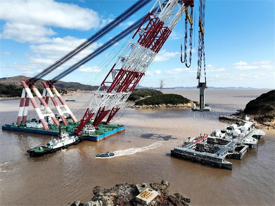 Le 24 février 2022, un groupe électrogène d'énergie marémotrice de quatrième génération d'un poids unitaire unique de 350 tonnes et d'une puissance de production de 1,6 MW et développé de manière totalement indépendante par la Chine est entré dans la mer dans la zone maritime de l'?le de Xiushan du comté de Daishan, à Zhoushan, dans la province du Zhejiang (est de la Chine). (Yao Feng / Pic.people.com.cn)