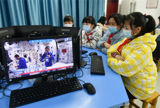 Des élèves de l'école primaire expérimentale Zigui de la ville de Yichang, dans la province du Hubei (centre de la Chine), assistent à la deuxième le?on de ? Classe Tiangong ? donnée par les ta?konautes de Shenzhou-13 dans la salle informatique de l'école, le 23 mars 2022. (Wang Huifu / Pic.people.com.cn)