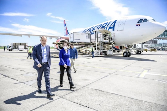 Le 22 mai 2021, l'ambassadrice de Chine en Serbie Chen Bo et le ministre serbe de la Santé Zlatibor Loncar ont accueilli un nouveau lot de vaccins Sinopharm contre la COVID-19 que la Serbie a achetés à l'aéroport de Belgrade en Serbie. (Photo fournie par l'ambassade de Chine en Serbie)