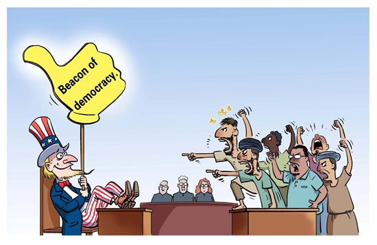Les états-Unis sont militaristes au nom de la ? démocratie ?, et ils ne sont pas un ? professeur ?, pas plus qu'ils ne peuvent prétendre agir comme un ? juge ? démocratique. Face aux accusations marquées par le sang et les larmes de réfugiés de nombreux pays du monde, les états-Unis ne peuvent que s'asseoir sur le banc des accusés de l'histoire.
