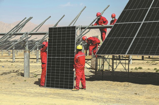 Des employés assemblent des panneaux photovolta?ques dans une centrale solaire à Aksu, dans la région autonome ou?ghoure du Xinjiang (nord-ouest de la Chine). (Photo / China Daily)