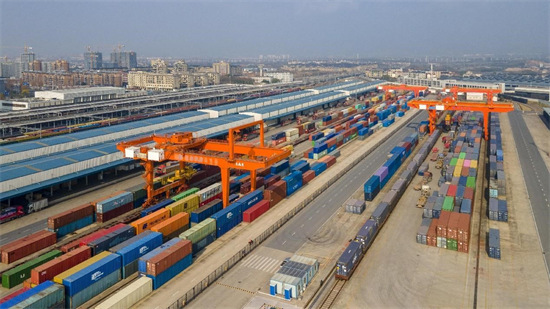 Le 6 janvier 2023, des conteneurs sont chargés dans un train de fret Chine-Europe sur une plateforme de la ligne de fret Yiwu-Xinjiang-Europe dans la ville de Jinhua de la province du Zhejiang (dans l'est de la Chine). (Hu Xiaofei/Pic.people.com.cn)
