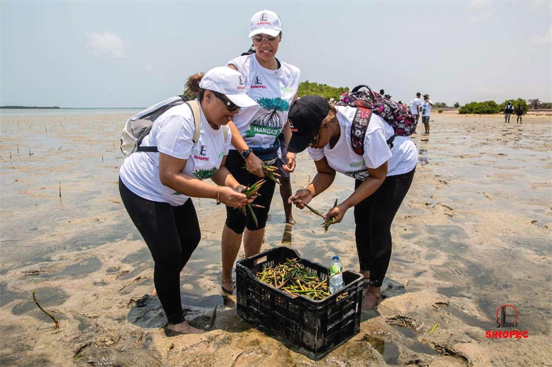 | Des employés de la succursale angolaise de Sinopec International Petroleum Exploration and Production Corporation (SIPC) plantent des semences de mangrove sur une plage. (Photo / Zhao Xuchi) |