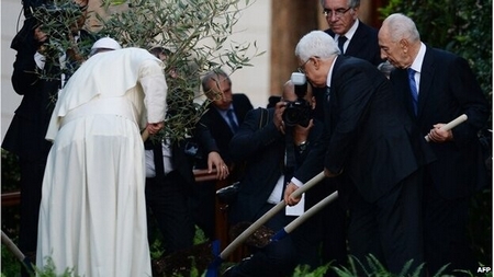| Le Pape Fran?ois, Shimon Peres et Mahmoud Abbas plantent un olivier en signe de paix. |