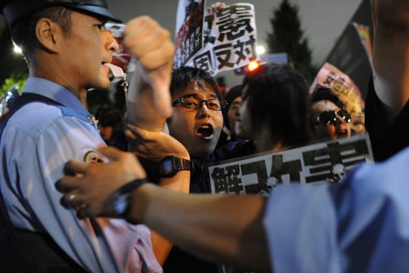 Les manifestants brandissaient des pancartes sur lesquelles ont pouvait lire "Tokyo contre le fascisme", "L'Article 9 régit. Parler haut. Maintenant ou Jamais. Respecter l'Article 9", " Complètement opposé à la résolution du cabinet", et criant dans les mégaphones "Ne détruisez pas la Constitution pacifiste", et " Démissionne Abe !".