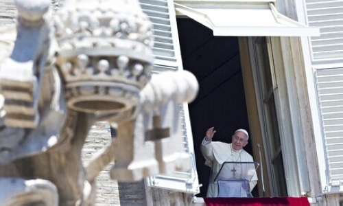 | Pape Fran?ois salue la foule de la place Saint-Pierre, alors qu’il prononce son discours dimanche au Vatican. |