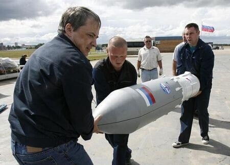 | Des ouvriers transportent une partie d’une fusée Angara pour l'exposer lors du salon de l’aéronautique MAKS-2009 près de Moscou, en ao?t 2009. |