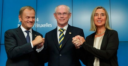 | Donald Tusk, Herman Van Rompuy et Federica Mogherini. |