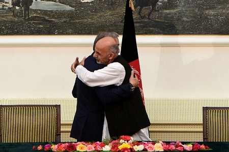 Les deux candidats se sont réunis au Palais présidentiel avec le président Hamid Karza? et leurs partisans, ils ont rapidement signé leurs deux exemplaires de la convention de quatre pages, puis se sont brièvement embrassés, sous les applaudissements d’un auditoire tiède. Dans une brève allocution, M. Karza? les a remerciés, lors d’un événement qui n’a pas duré plus de 10 minutes - en contraste avec le long processus électoral qui a commencé en février, est passé par deux élections et impliqué un audit aussi long que controversé, que les Nations Unies ont qualifié de plus exhaustif qu’elles n’aient jamais supervisé.