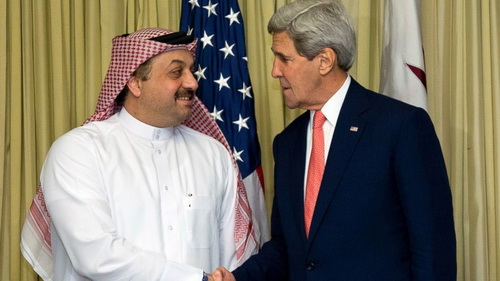 | Khalid bin Mohammad Al Attiyah, Ministre qatari des affaires étrangères, et John Kerry au Caire, le 12 octobre 2014. |
