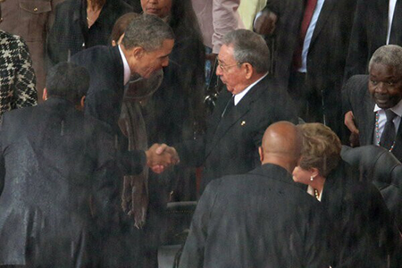 | Barack Obama et Raúl Castro en 2013. |