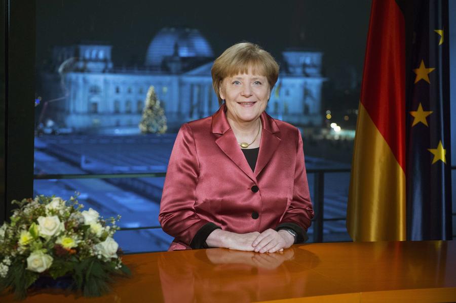 La chancelière allemande Angela Merkel pose après l'enregistrement de son discours du Nouvel An à la Chancellerie à Berlin, le 30 décembre, 2014. [Photo / Agences]