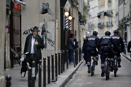 | Des policiers patrouillent lundi dans une rue du Marais à Paris, qui abrite une importante communauté juive. |