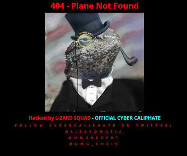 Le site www.malaysiaairlines.com affichait la photo d'un lézard dans un chapeau haut-de-forme avec un monocle et un smoking, suivi des messages "404 - Avion non trouvé" et "Piraté par le groupe lézard - Cyber califat officiel". Une chanson pouvait également être entendue en arrivant sur le site. Certains médias rapportent que plus t?t, le site piraté contenait les mots "L'état islamique vaincra" mais que le slogan n'était plus visible. L'état islamique a proclamé un califat, une forme de gouvernement islamique, après s'être emparé de territoires en Irak et en Syrie. Dans une déclaration, Malaysia Airlines a expliqué que son site n'était pas piraté mais que les utilisateurs étaient redirigés vers un site de cyber pirates. Elle a ajouté que le site officiel serait rouvert au cours des prochaines 22 heures.