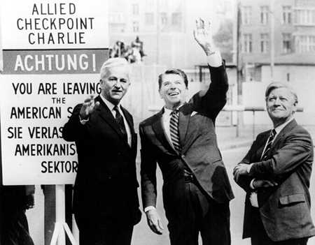 | Richard von Weizs?cker, alors maire de Berlin Ouest, le Président américain Ronald Reagan et le Chancelier ouest-allemand Helmut Schmidt, en 1982. |